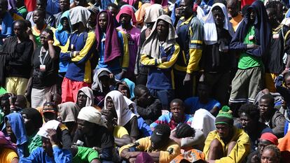 Los desembarcos de migrantes en Lampedusa, aunque se han reducido considerablemente en los últimos dos días, no cesan. La tarde del viernes, decenas de migrantes recién llegados a la isla esperaban en el muelle bajo un sol que abrasaba, con una expresión a caballo entre la desesperación y la resignación, a recibir asistencia y a ser trasladados al centro de acogida. Mientras tanto, un barco de las Fuerzas Armadas italianas desembarcaba a otro nutrido grupo que había rescatado en el mar. Tras el pico de llegadas, las autoridades no dan abasto para contar las llegadas. La noche del jueves al viernes llegaron algo más de 200 migrantes.