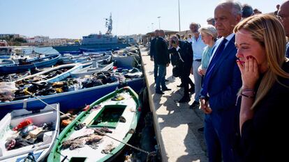 La primera ministra italiana, Giorgia Meloni, acompañada de la presidenta de la Comisión Europea, Ursula von der Leyen, ha viajado este domingo a Lampedusa, epicentro de la emergencia migratoria en el Mediterráneo y reflejo de los retos que Italia y la UE tienen por delante, para reclamar a Bruselas mano dura. “El objetivo deben ser las repatriaciones, no la redistribución de los migrantes” entre los Veintisiete, pidió la líder ultraderechista. Y advirtió: “El futuro de Europa se juega aquí, porque el futuro de Europa depende de la capacidad de Europa de afrontar los grandes desafíos, como estos flujos migratorios sin control”.