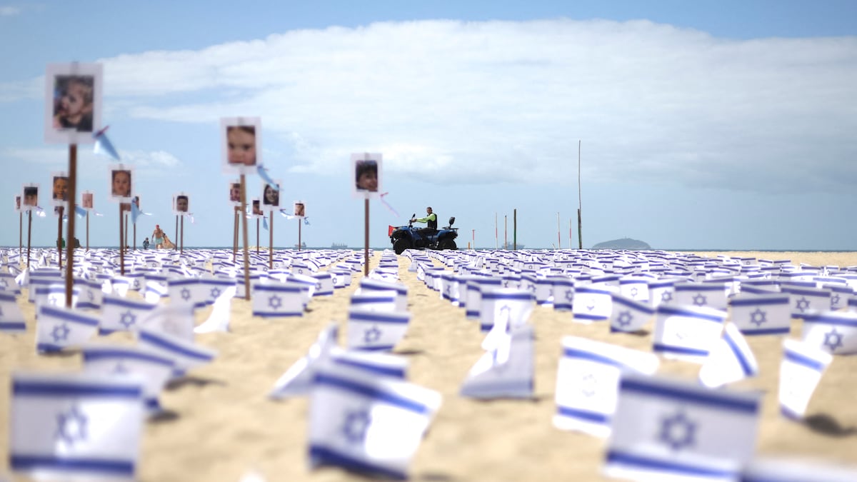 En las últimas semanas, la ONG Río de Paz ha instalado homenajes simbólicos en la popular playa de Copacabana, en Río de Janeiro, para recordar a las víctimas de la guerra entre Israel y Gaza. Esta semana la asociación plantó cientos de banderas de Israel en la arena y colocó imágenes de 34 niños y adolescentes que fueron tomados como rehenes por Hamás hace un mes.