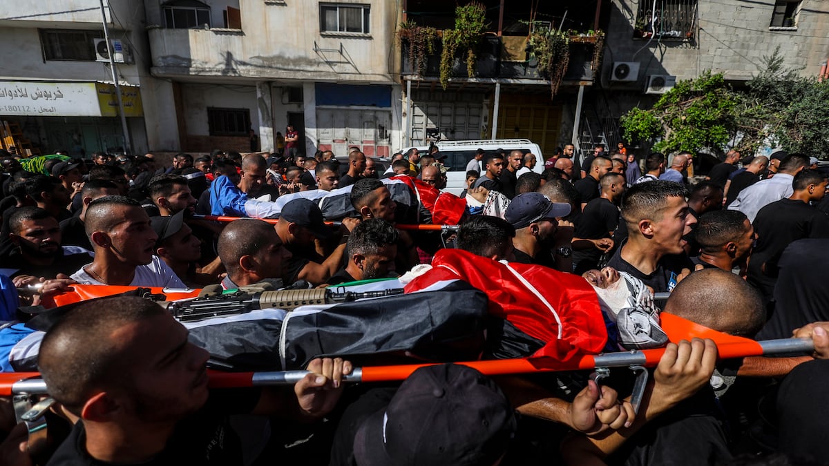 Por el camino, bajo un sol que aprieta, algunos jóvenes van sacudiendo las moscas de los rostros de los finados, que presentan heridas, hematomas y orificios de balazos. Hay vecinos que portan capas, cintas en la frente o banderas verdes de Hamás, el movimiento islamista que gobierna Gaza y cuyo brazo armado dejó 1.400 muertos en un ataque nunca visto hasta ahora contra Israel el 7 de octubre y detonante de la actual guerra. También hay algunas enseñas amarillas de Al Fatah, el partido laico que domina la Autoridad Nacional Palestina, que lleva las riendas de Cisjordania. Algunas de las consignas giran en torno a la necesidad de unión de las diferentes facciones palestinas.