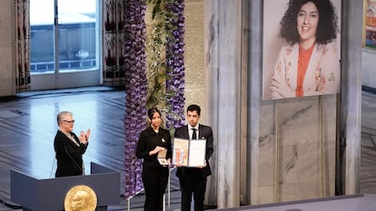 Los hijos de la Premio Nobel de la Paz de 2023, la iraní Narges Mohammadi, han recogido este domingo en el Ayuntamiento de Oslo el galardón concedido a esta defensora de los derechos de las mujeres. Mohammadi no ha podido acudir al acto porque desde noviembre de 2021 está cumpliendo una condena de 10 años de cárcel en Teherán por difundir propaganda contra el Estado. En una carta leída por sus hijos, los gemelos Kiana y Ali, de 17 años, la activista ha asegurado que el pueblo iraní acabará venciendo al autoritarismo de un Gobierno que ha perdido la legitimidad y el apoyo público. “La juventud de Irán ha transformado hoy las calles y los espacios públicos en un escenario de resistencia civil generalizada. La resistencia está viva y la lucha perdura” ha señalado Mohammadi a través de su escrito, escuchado por un centenar de asistentes a la ceremonia en la capital noruega, presidida por los reyes Harald V y Sonia.