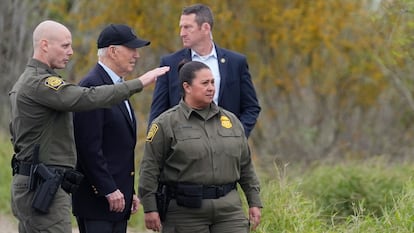 El presidente de Estados Unidos, Joe Biden, se ha fotografiado este jueves ante el río Bravo (río Grande, para los estadounidenses) junto a miembros de las patrullas fronterizas en Brownsville (Texas). Al tiempo, su más que probable rival en las elecciones presidenciales de noviembre, Donald Trump, posaba ante la alambrada que hay a la orilla de ese mismo río en Eagle Pass, también en Texas, a unos 500 kilómetros de distancia. Los gestos han sido parecidos. Los discursos, sin embargo, han sido muy diferentes. Mientras Biden ha ofrecido unidad en política migratoria a su rival, Trump ha usado su discurso más duro sobre la inmigración, al hablar de “invasión”, de que llegan “hombres en edad de luchar” que parecen “guerreros”. “Esto es como una guerra”, sentenció.