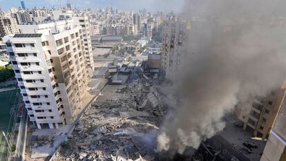 Un humo negro y constante hace aún difícil acercarse a los escombros. Sale de los restos de cuatro edificios residenciales bombardeados esa misma madrugada por la aviación militar israelí, en una dinámica que hace apenas una semana parecía impensable y ahora se ha convertido en cotidiana en Dahiye, el antiguo hormiguero de personas, coches y motos al sur de Beirut que luce casi fantasma. Cada noche, el portavoz del ejército israelí en lengua árabe, Avijai Adree, difunde tres mapas con inmuebles marcados y ordena a quienes vivan cerca que salgan de inmediato y se alejen al menos medio kilómetro. Una media hora después comienzan los bombardeos, visibles desde la capital. El foso que el derrumbe de los inmuebles ha dejado aquí hace pocas horas es enorme. Un vehículo de bomberos se abre paso para terminar de apagar el incendio.