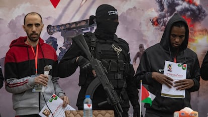 Al mediodía comenzó la segunda ceremonia, en el campamento de refugiados de Nuseirat. Los milicianos llevaron al escenario a tres de los rehenes tomados el 7 de octubre de 2023: Eliya Cohen, de 27 años; Omer Wenkert, de 23; y Omer Shem Tov, de 22. A diferencia de la entrega en Rafah, los tres se mostraron sonrientes y felices. Sobre todo Shem Tov, que ha besado en la frente a dos milicianos, lanzaba besos al aire y hacía el signo de la victoria. El sexto rehén, el palestino con ciudadanía israelí Hisham al Sayed, ha sido entregado en Gaza capital y lejos de las cámaras, en señal de respeto a su familia, ha precisado Hamás. Además de por su identidad, padece un trastorno mental y estaba retenido desde la última vez que se coló por su propio pie en el enclave, en 2015.
