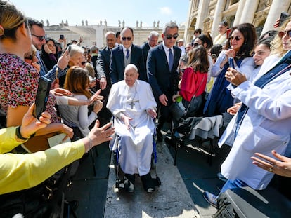 Varios vídeos del Papa colgados en redes sociales a primera hora de la tarde por anónimos visitantes de la basílica de San Pedro dan testimonio de una nueva sorpresa de Francisco, que en principio debe cuidarse y guardar aislamiento tras 37 días hospitalizado con una neumonía: ha aparecido a las 13.00 en el templo, en silla de ruedas, y con una indumentaria insólita. Jorge Mario Bergoglio, de 88 años, no llevaba el habitual hábito blanco papal, sino que iba vestido de calle. Llevaba un pantalón negro, camiseta blanca y estaba cubierto por una manta de rayas o un poncho, en las imágenes no se aprecia con precisión. Es una imagen de cotidianeidad inédita, nunca se había visto a un Papa moverse en camiseta, solo a Juan Pablo II en pijama en la cama del hospital tras el atentado que sufrió en 1981. Cuando el portal de información del Vaticano, Vatican News, dio la noticia no difundió las imágenes. Francisco respiraba, como hacía en la convalecencia y en los días siguientes, con cánulas nasales conectadas a una bombona de oxígeno que llevaba en el respaldo de la silla. Mostraba un aspecto aún frágil, 18 días después de ser dado de alta.