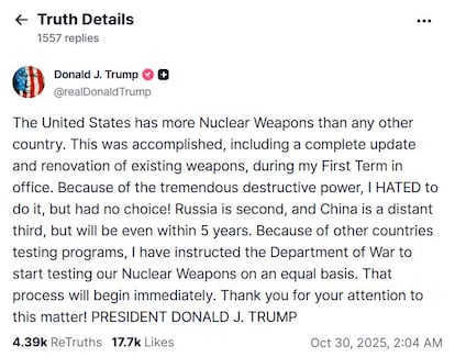 En una publicación en su red social, Truth Social, el republicano ha afirmado que ha dado la orden de reanudar inmediatamente las pruebas con armamento nuclear, lo que en caso de realizarse pondría fin a una moratoria de más de tres decenios en el marco del Tratado de Prohibición Total de Ensayos Nucleares (CTBT, en sus siglas en inglés). “He dado instrucciones al Departamento de Guerra [el Pentágono] para que comience a probar nuestras armas nucleares en igualdad de condiciones. Ese proceso comenzará de inmediato”, escribió.