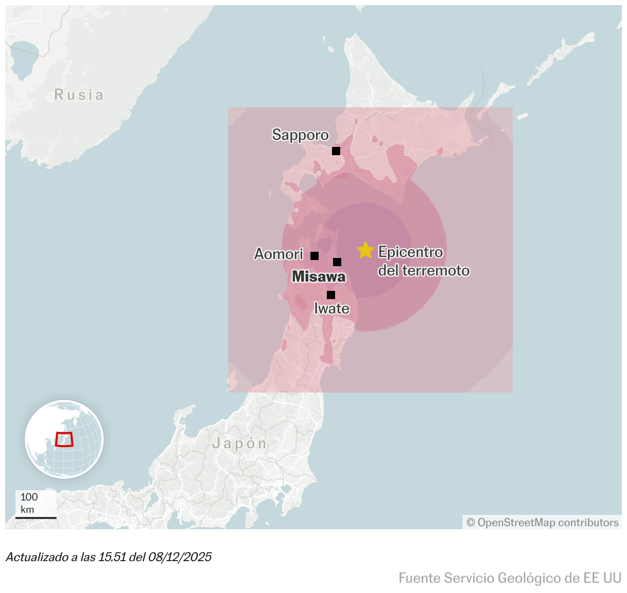 La AMJ ha activado la alerta de tsunami de hasta tres metros para las costas de la prefectura de Aomori, la vecina Iwate y la punta sur de la isla de Hokkaido, la más septentrional del archipiélago, después de que el sismo sacudiera gran parte del norte y este de Japón a las 23.15 (las 15.15 en la España peninsular). El epicentro se situó a 80 kilómetros de la costa de la prefectura de Aomori y a una profundidad de 50 kilómetros, según la Agencia Meteorológica. Además, en la hora posterior al terremoto, se han registrado varias réplicas, entre ellas una de magnitud 5,6, dos de 3,6 y una de 3,9.