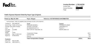 En concreto, los archivos muestran que Jeffrey Epstein y su pareja Ghislane Maxwell le enviaron dos paquetes a los Aznar en 2003 y 2004. El primero de ellos lo remitieron cuando aún era presidente, en septiembre de 2003. Se trata de un paquete pequeño, por el que los magnates estadounidenses pagaron al servicio de mensajería Fedex 32,62 dólares por enviarlo desde sus oficinas en Nueva York al Palacio de la Moncloa, en Madrid. “Presidente y Ana Aznar. Complejo de La Moncloa”, se lee en el destinatario.