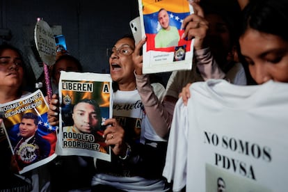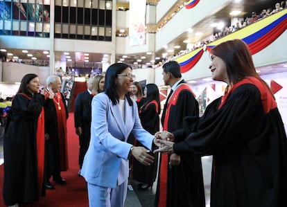 Gaby Oraa (REUTERS)La presidenta interina de Venezuela, Delcy Rodríguez, habla bajo una imagen enmarcada del expresidente Nicolás Maduro y su esposa, Cilia Flores, durante la ceremonia de apertura del nuevo año judicial en el Tribunal Supremo de Justicia, este viernes en Caracas.Ariana Cubillos (AP)Familiares de presos políticos muestran su alegría frente al centro de detención Helicoide, este viernes en Caracas. Gaby Oraa (REUTERS)La presidenta interina de Venezuela, Delcy Rodríguez, estrecha la mano de un miembro del Tribunal Supremo de Justicia durante la inauguración del nuevo período judicial junto a magistrados del alto tribunal, este viernes en Caracas.MIRAFLORES PALACE (via REUTERS)