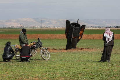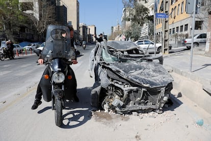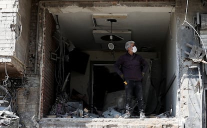 Varias personas permanecen junto a un misil iraní tras caer cerca del aeropuerto internacional de Qamishli (Siria), este miércoles. Orhan Qereman (REUTERS)Un trabajador iraní entre los escombros de un edificio bombardeado en el centro de Teherán (Irán), este miércoles.