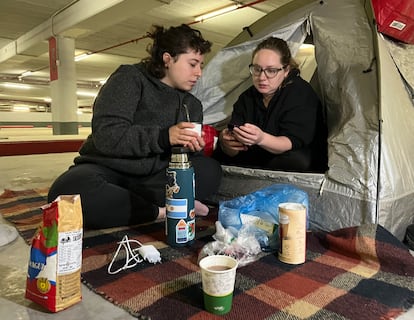 “Bienvenidos a nuestra casa”. Sofía Salvador y María Tulitzeba bajan en chanclas en el ascensor de un centro comercial de Haifa —la principal ciudad del norte de Israel, atacada estos días tanto por Irán como por la milicia libanesa Hezbolá― desde la zona en superficie (que alberga un supermercado, una farmacia y algunas cafeterías) hasta la planta -5, donde llevan días instaladas. Allí hacen vida día y noche, en una tienda de campaña donde se sienten más seguras. No están solas: la planta, casi la más profunda del aparcamiento, se ha convertido en un minibarrio subterráneo con una treintena de tiendas de campaña, niños correteando, perros deambulando y familias comiendo en mesas de plástico. Como en un camping al aire libre, pero en tiempos de guerra y bajo la luz de los neones, encendidos las 24 horas.