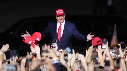Toda la fiesta de Miami se concentraba este domingo en la explanada del aeropuerto de Opa-locka. Mientras la ciudad bajaba sus persianas debido al toque de queda impuesto a medianoche, tras más de 4.000 muertes por la pandemia y un repunte de 8.000 casos esta semana, en este rincón del norte se celebraba el after de Donald Trump. El quinto mitin de una frenética jornada de un intenso fin de semana, que comenzó casi hacia la media noche del domingo y continuó durante una hora y media. Cientos de seguidores movían de un lado a otro las manos para bailar el himno salsero que pide el voto en su nombre, se hacían selfis y lo recibían como una estrella de rock al bajar del Air Force One. “Dios mío, cuánta gente”, comentaba el presidente al subir al escenario. El espectáculo acababa de comenzar.