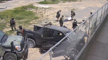 Las imágenes, a las que ha tenido acceso EL PAÍS, muestran cómo los soldados, con los cinco ya muertos, alteran además el lugar de los hechos. Uno de los elementos agarra armas largas con una bolsa roja para evitar tocarlas con las manos y dejar huellas, y las coloca junto a los cadáveres. Más tarde, otro se da cuenta de que uno de los cuerpos todavía lleva las esposas, que ellos mismos le han puesto antes. Pide la llave a otro compañero y se las quitan. Entre medias, paramédicos han acudido a la escena a llevarse a uno de los cinco, el que fallecería más tarde en el hospital. La Fiscalía no llegaría allí hasta pasadas las horas.