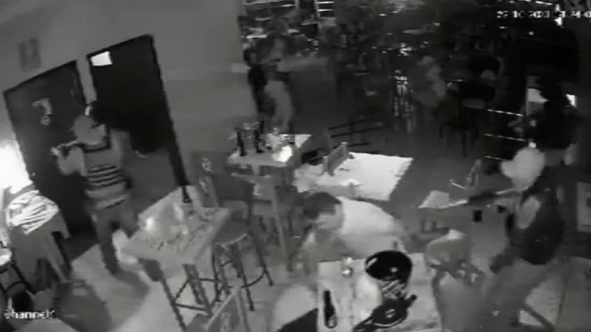La cámara de seguridad del local muestra cómo siete personas con fusiles largos y chalecos antibalas roban y golpean a los clientes
