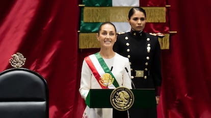 Da la impresión de que Claudia Sheinbaum ha entrado en solitario al salón de sesiones donde ha de tomar posesión del cargo como presidenta de México. Pero, en realidad, detrás de ella, o a su lado, o delante, o arriba, han entrado miles, millones de mujeres mexicanas. Se han agolpado en la puerta de la Cámara de Diputados y se han metido a raudales, como un mar incontenible. Sheinbaum, la primera mujer que conducirá el país tras 65 hombres que le antecedieron, ha dicho al jurar al cargo: “En 503 años de historia [desde la Conquista española], por primera vez llegamos las mujeres a la presidencia. Y digo llegamos, porque no llego sola, llegamos todas”. La investidura de Sheinbaum, una científica izquierdista de 62 años, ha estado nutrida de alusiones al feminismo, una de las banderas de la mandataria, y también ha sido un homenaje al expresidente Andrés Manuel López Obrador. En una imagen que desborda simbolismo, Sheinbaum ha recibido la banda presidencial de manos de la emblemática diputada Ifigenia Martínez, una de las primeras luchadoras del movimiento izquierdista en México.