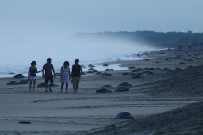 En mitad de una noche cerrada de mayo, las huellas de los turistas en la arena mojada se iluminan al contacto con la bioluminiscencia. Caminan en silencio, no quieren molestar a los cocodrilos que los vigilan en una laguna a pocos metros de la orilla del océano Pacífico. De vez en cuando rompen la oscuridad con una luz roja —más respetuosa con la visión nocturna de la fauna local— para esclarecer cualquier sombra que se parezca al animal que todos ansían ver. Buscan a las tortugas marinas. Cualquiera de las seis de las siete especies que existen que se acercan a desovar a Escobilla, en la costa de Oaxaca. Esta playa es una de las que más registros de llegadas de tortugas tiene el mundo, y la población busca a través del ecoturismo crear consciencia y proteger a una población amenazada. Cuesta creer que a este turístico santuario, apenas una generación atrás, las visitas que llegaban eran pocas y en su mayoría buscaban comerciar o degustar uno de los platos más icónicos: los huevos de tortuga.