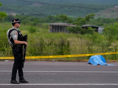 Él fue el primero de los 14 cuerpos que se contabilizaron ese día, una de las jornadas más sangrientas desde que se desató la guerra entre facciones del narco que se disputan el control del Estado. A solo ocho kilómetros de allí, los agentes encontraron otro cadáver en la colonia Amado Nervo en condiciones similares: envuelto en plástico y con un mensaje escrito. Los vecinos habían llamado a la policía tras escuchar disparos antes de encontrar el cuerpo. En la autopista que conecta Culiacán con Las Brisas, a un costado del asfalto y recargado sobre un coche, apareció otro con un siniestro mensaje y con los ojos vendados.