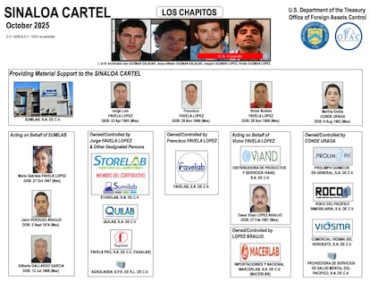 El golpe principal ha sido contra la empresa de suministros de laboratorio Sumilab, con sede en Culiacán. El Departamento del Tesoro, que ya sancionó a la compañía en 2023, insiste en que este negocio participa en la cadena de producción de fentanilo para el Cartel de Sinaloa. EE UU identifica detrás a la familia Favela López, en concreto a cuatro hermanos (Víctor Andrés, Francisco, Jorge Luis y Gabriela) y a algunas de sus parejas (Jairo Verdugo y Gilberto Gallardo). EL PAÍS desveló hace dos años que el cliente favorito de Sumilab ha sido el propio Estado de Sinaloa: entre 2018 y 2022, el Gobierno entregó a la empresa contratos públicos por 14,7 millones de pesos.