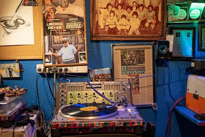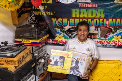 Rada comenzó a tocar cuando tenía 13 años junto a su hermano, que lo dejó pronto con el proyecto porque decidió ingresar a la academia de policía. El joven viajaba a Tepito, barrio bronco de la capital mexicana, donde podía encontrar los discos a precios módicos. “Para mí era de enorme alegría, porque me apasiona esta música. Es de un ritmo que aunque no puedas bailar, lo escuchas y empiezas a mover el piecito así”, dice haciendo un movimiento con las piernas. “O sea, esto es algo muy bonito, porque la música guarda un mensaje de alegría”, afirma. En el altar de Rada están bandas míticas como La Sonora Dinamita, el compositor Andrés Landero o el músico Humberto Pabón, del Grupo Cañaveral, uno de los más importantes de cumbia en México.