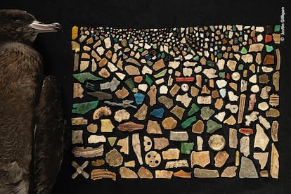 Algunas de las fotografías provocan dulzura, como Un momento de tranquilidad, de Hikkadawu Liyanage Prasantha Vinod, de Sri Lanka, que muestra a un joven macaco de toque durmiendo en brazos de un adulto de su especie. Hay otras que indignan, como la que muestra un ave muerta y al lado decenas de microplásticos, titulada Una dieta de plástico letal, del australiano Justin Gilligan. “Crea un mosaico a partir de las 403 piezas de plástico encontradas en el tracto digestivo de una pardela paticlara muerta”, explican los curadores. Y hay otras que entristecen, como la de un orangután sentado en una banca, vestido con un pantalón corto a cuadros, las manos entrecruzadas y la mirada perdida. Son animales utilizados para entretener a turistas. “Habla de como los seres humanos también estamos no solamente amenazando su hábitat, sino haciéndoles daño por un entretenimiento”, comenta Chávez Menéndez.