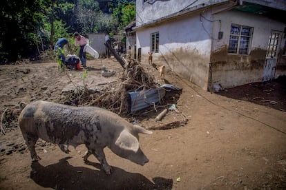 La única forma de llegar a Chapula ahora es a caballo o caminando por las montañas, un trayecto que puede tomar más de tres horas de caminata desde el punto más cercano. Muchos de sus habitantes, resignados, ya no volvieron después de las lluvias. Pero Zoralia Cruz Hernández, de 32 años, no quería dejar atrás dos cosas fundamentales para ella: una figura de aproximadamente un metro de San Judas Tadeo, que asegura siempre la ha cuidado, y sus animales, entre ellos, dos cerdas. Una de ellas está cerca de parir. Además de cerdos, perros, algunos patos y las gallinas que sobrevivieron empiezan a reclamar ahora las calles del pueblo como suyas, ya que no hay forma de sacarlos de ahí.