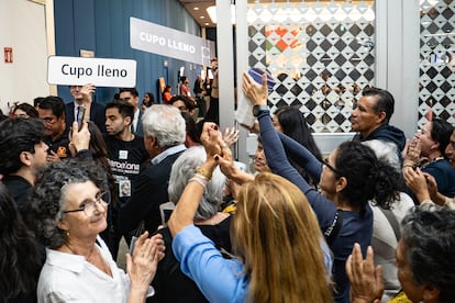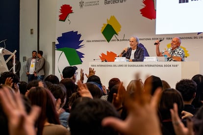 Si el afecto se midiera en decibelios, Joan Manuel Serrat habría batido todo récord este jueves, durante su visita a la FIL de Guadalajara. El público que ha logrado entrar a la sala lo ha recibido como el símbolo que es en México —un cariño de ida y vuelta—, pero más ruidoso ha sido el que se ha quedado fuera, batallando con los letreros de cupo lleno, al grito de “¡puertas abiertas con Serrat!”. Ya lo dijo su cuate, Joaquín Sabina: hay amores que matan y el estruendoso amor de sus seguidores casi termina con un acto que el cantautor ha abandonado molesto, durante un cuarto de hora, por la imposibilidad de escuchar a su interlocutor, su viejo amigo Benito Taibo.