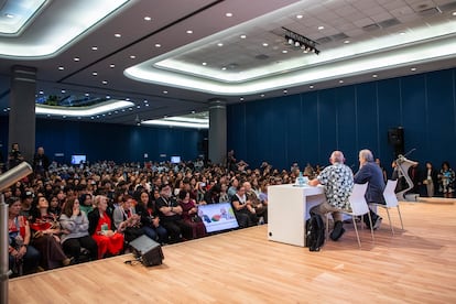 “Ha dicho que llegó a la poesía gracias al amor. ¿Qué papel tiene una emoción así en un tiempo en el que somos constantemente bombardeados con mensajes de odio?”, le ha lanzado un muchacho que lo escuchaba por primera vez. “Cómo ha cambiado su manera de mirar el mundo desde que empezó a componer?”, le ha cuestionado otra joven. “Hace poco descubrí su música y me fascinó, porque mezcla la poética y la música. Nunca consideré que teníamos tantas cosas en común”, ha reconocido un tercer chaval, genuinamente sorprendido. De mucho antes lo conocía la última joven en hablar, a quien su padre le ponía sus canciones cuando apenas tenía cinco años. Luego ya no hizo falta. Ella sola se lo ponía mientras estudiaba literatura en la Universidad. “Cuando leí La odisea, escuchaba Mediterráneo y me llevaba a todo ese mundo mítico”, le ha agradecido.