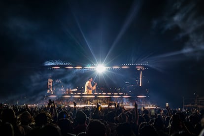 Ocho conciertos seguidos en la misma ciudad son mucho dinero —unos 177 millones de dólares de derrama económica, calcula la Cámara de Comercio de la capital— pero también son muchos conciertos. Así, para tratar de dar singularidad a cada uno, el artista ha preparado un segmento exclusivo para cada función, uno que no se va a repetir. El de este jueves lo ha protagonizado el cantante colombiano Feid, también conocido como Ferxxo. “Los vino a ver a ustedes directo desde Medellín, Colombia”, ha explicado Benito, después de cantar Perro negro. En el concierto también ha estado Chuwi, con quien tiene WELTiTA, y el grupo puertorriqueño Los Pleneros de la Cresta, que disfrutan CAFé CON RON.