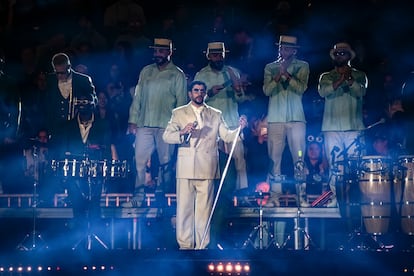 No hay propósito escondido ni en el álbum ni en la gira de Bad Bunny, pero, por si acaso, el cantante lo recuerda a cada rato: esto es una oda a Puerto Rico. La isla, un territorio controlado por Estados Unidos, cuyos habitantes son ciudadanos pero no tienen derecho a elegir al presidente, está ahora viajando por el mundo. Llega con su pava, su sapo concho, su cuatro, su bomba y su plena, con su lengua. “Gracias por querernos tanto y hacer que nuestra música haya llegado tan lejos. Esta es la música de mis raíces”, ha dicho el cantante, que ha homenajeado también a la región: “Este show es simple, este show se trata de ustedes, de nosotros, de la unión de México, Puerto Rico y América Latina”. “Esta noche Puerto Rico y México son solo uno”, ha insistido durante la presentación. Al grito de “Benito, hermano, ya eres mexicano”, el artista ha concedido: “Yo por esta noche soy mexicano y ustedes, puertorriqueños”.