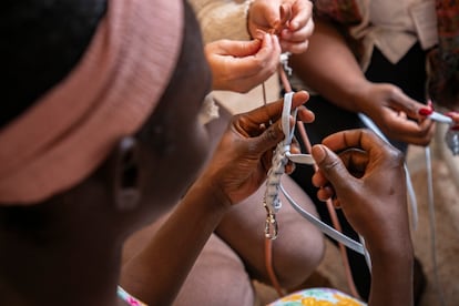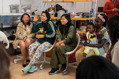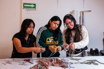 En un amplio salón rodeadas de telas, hilos, cintas de medir y ropa colgada en ganchos, un grupo de mujeres trenza unos cordones con esmero y paciencia. Al cabo de unos minutos, empieza a tomar forma de pequeños llaveros de distintos colores. Zeneida Avendaño, una caraqueña de 58 años, muestra entusiasmada cada paso de la elaboración de uno de los muchos artículos que nacen en este taller. “Estoy ilusionada con este proyecto que nos permite un espacio seguro y a la vez un crecimiento personal y profesional”, asegura. Junto a otras seis artesanas migrantes de Perú, Haití, Guatemala y Venezuela, es parte de Tejiendo futuros, una iniciativa de la empresa de ropa Básicos de México apoyada por la Organización Internacional para las Migraciones (OIM) que busca que este pequeño emprendimiento de productos de macramé se convierta en un sustento para mujeres que, como ellas, buscan salir adelante en un país desconocido.