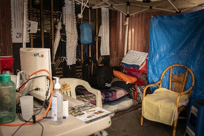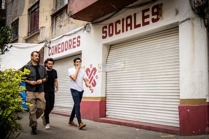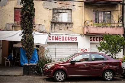 Sentada en la puerta del edificio contiguo al de la panadería, una señora se prepara un café soluble. Está calentando el agua en una cafetera eléctrica enchufada a la maraña de cables de la calle. Sobre una mesa plegable tiene los vasos de plástico y el azúcar. Detrás, una pila de mantas que han traído los vecinos para ayudarla a pasar la noche de un noviembre especialmente frío en la Ciudad de México. A María (que prefiere no dar su apellido) la echaron de su casa a finales de verano, igual que al resto de 20 familias por despojo, un delito parecido a la ocupación. Los sacaron de madrugada a la carrera. Sus cosas siguen dentro y desde entonces, se turnan para hacer guardia en la puerta. Todo el edificio está precintado por la Fiscalía de la ciudad, incluido el local del bajo: un comedor social. María recuerda que hasta que lo cerraron se amontonaban a diario largas filas gente para comer un menú completo por 10 pesos (unos 50 céntimos de dólar).