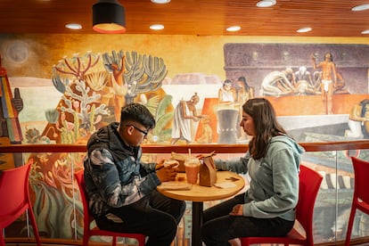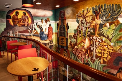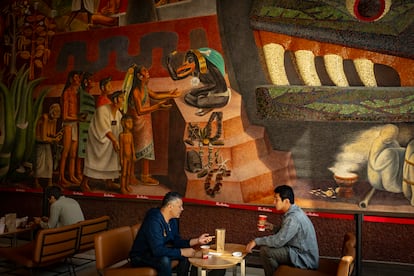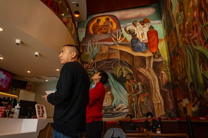 La obra está montada en la parte exterior —frente al estacionamiento—, y en el interior del local sobre dos paredes. Por la puerta entran oficinistas, estudiantes y repartidores de comida por aplicación. Todos, sin excepción, observan fijamente. “No sé si el más bonito del mundo, pero sí uno de los más bonitos”, dice un hombre de la tercera edad que vino a encontrarse con su esposa.