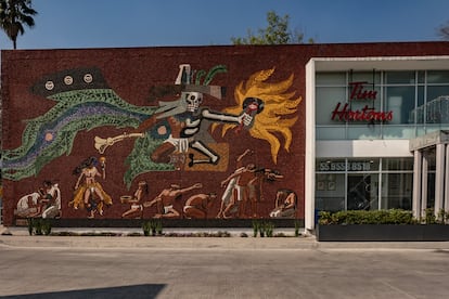 Lo primero que hacen los clientes al entrar y lo último que hacen al salir es mirar el mural de dimensión colosal: 18 metros de largo por unos seis de alto, aproximadamente. La cadena de cafeterías canadiense Tim Hortons abrió una nueva sucursal al sur de Ciudad de México, en el predio que albergó alguna vez a los Laboratorios CIBA desde la década de 1950 hasta 2021, ya con el nombre de Laboratorios Novartis, y que presumía de tener dos murales de José Chávez Morado, uno de los pintores y muralistas de la corriente nacionalista más representativos de México.