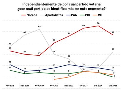 En ese proceso, Morena no solo creció, sino que arrasó con una de las constantes identitarias más conocida de los mexicanos: su apartidismo. Durante décadas, la identidad dominante de los mexicanos había sido ser apartidista. Para 2024, solo el 13% lo era.