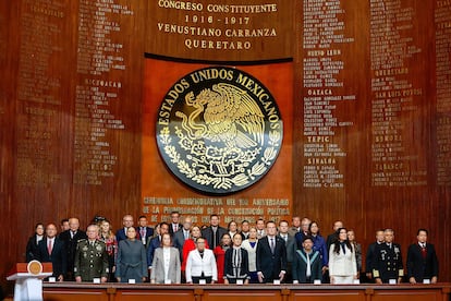 El 109 aniversario de la promulgación de la Constitución de 1917 también ha servido al régimen para mostrar su fuerza y su simbología. Antes de Sheinbaum, ha tomado la palabra el ministro Hugo Aguilar, presidente de la Suprema Corte de Justicia de la Nación, quien ha iniciado su discurso en mixteco, su lengua natal. También han hablado las presidentas de las dos Cámaras del Congreso de la Unión, la senadora de Morena Laura Itzel Castillo y la diputada panista Kenia López Rabadán. En el acto estaban presentes más de 20 gobernadoras y gobernadores; la jefa de Gobierno de la Ciudad de México, Clara Brugada; secretarias y secretarios del gabinete presidencial, legisladores y ministros. Ante ellos, Sheinbaum ha hecho una defensa del proyecto que encabeza, en la lógica histórica de las cuatro transformaciones que López Obrador incorporó al discurso oficial desde 2018.