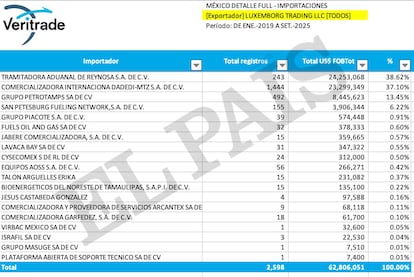 Dos de esas empresas, Tramitadora Aduanal de Reynosa, S.A. de C.V. y Grupo Petrotamps, S.A. de C.V., fueron clasificadas en 2025 por el SAT, la agencia tributaria mexicana, como compañías que simulan operaciones para evadir impuestos o blanquear recursos, conocidas comúnmente como factureras. Luxemborg Trading LLC registró 243 operaciones con Tramitadora Aduanal de Reynosa con un valor de 24,2 millones de dólares, lo que coloca a esta empresa como la mayor proveedora de servicios de la importadora texana. Grupo Petrotamps le hizo 492 envíos con valor de 8,4 millones de dólares. Una tercera empresa, San Petesburg Fueling Network, S.A. de C.V., le envió 155 cargamentos por 3,9 millones de dólares.