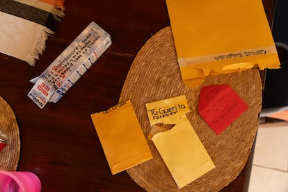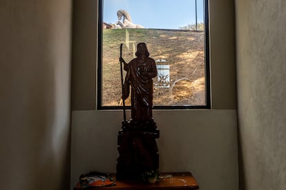 Del operativo contra el Ejército quedan todavía las huellas. En el estacionamiento están esparcidos los casquillos, hay sangre en el suelo y también en una camioneta. Hay una moto tumbada con disparos. Aparecen botas, cinturones y guantes tácticos, pasamontañas, gafas de protección contra balas, bragas de cuello militares, cartucheras y funda para navajas, desperdigados por todos los niveles de la propiedad. Hay cristales estallados en la mayoría de las cabañas, tanto en puertas como en ventanas. Hay huecos de disparo de bala en paredes y en entradas, también al lado de estatuas religiosas. Hay una estampilla de San Judas y de la Virgen de Guadalupe casi en cada vivienda, también oraciones y cartas de amor. “No se olvide de mí. Te amo mucho”, se lee en un sobrecito rojo. “Tu Güerita forever”, en otro amarillo.