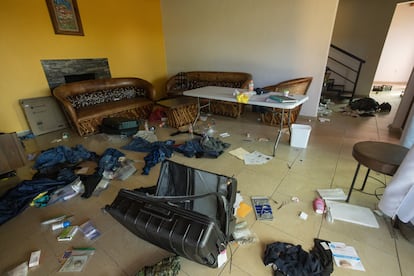 Las 10 cabañas en las que ha entrado EL PAÍS parecían haber sido ocupadas y desalojadas con urgencia: quedaba comida en ollas y platos, sartenes a medio hacer en el fuego, excrementos en los váteres y toallas femeninas en las papeleras, pasta de dientes en los lavabos y cuchillos sucios en las encimeras. El recibidor de la casa más alta estaba lleno de decenas de medicamentos, incluido un tanque de oxígeno e insulina, y había pastillas para el dolor y melatonina en cada cabaña. Había cuadernos con garabatos, invitaciones a torneos de toros en ranchos e instrucciones de ejercicios de pesas. Había jeans, playeras, calcetines y boxers en las habitaciones y en el pasto. Había cajas de cocos y patatas congeladas, cereales, huevos, latas de maíz, queso, refrescos, botellas de alcohol y galletas dispersos por toda la propiedad, también en los alrededores.