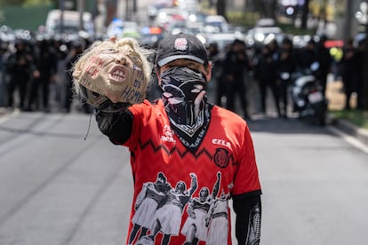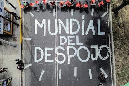 Muchos de los murales e intervenciones fueron creadas por el artista multidisciplinario Vlocke Negro (Ciudad Nezahualcóyotl, Estado de México) y se han convertido en un símbolo de resistencia contra el Mundial. “Ya estoy acostumbrado a que mi arte sea efímero, pero también, precisamente, en la persistencia existe esa continuidad. Ese resistir y existir ocurre cuando se regresa. Cuando empezamos a pintar en el Azteca, nos borraron inmediatamente. Duró muy poco, 24 horas máximo. Entonces, dijimos que íbamos a regresar las veces que fueran necesarias. Y bueno, así lo hemos hecho. Cuando lo vuelves a hacer la gente empieza a valorar tu persistencia. El grafiti o la consigna es un tipo de arte incómodo que es borrado”, zanja en entrevista con EL PAÍS. “La ciudad es un espacio en disputa difícil de ganar porque la policía siempre está vigilando. Hay que habitarlo de todas maneras. Ya sea ocupando las vías con tu bicicleta, pegando un cartel o pintando un mural. Hay muchas manifestaciones que se pueden hacer en el espacio público, pero hay que hacerlo y hay que hacerlo sin permiso. No nos han dado otra alternativa”, dice con firmeza.