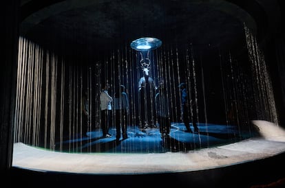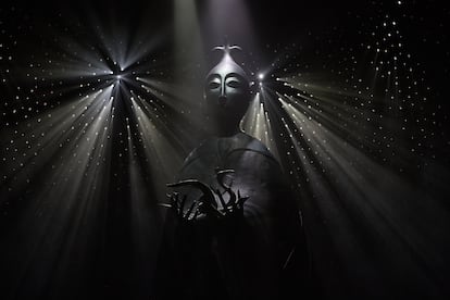 La nueva exposición de Leonora Carrington en Ciudad de México, una “experiencia inmersiva”, inicia como cualquier otra con fotografías de distintas épocas de la artista, algunas de sus pinturas como Y entonces vimos a la hija del Minotauro, creada en 1953, o la litografía Janan, de 1974. Son unos 23 metros que serpentean entre muros amarillos y blancos, hasta que el espectador se topa de frente con una advertencia: “Estás a punto de entrar a un laberinto habitado por 11 seres creados por Leonora Carrington. Búscalos. Deja que te inspiren. Observa con calma, los espacios del laberinto tienen un ritmo propio”. Junto a la entrada del entramado, que encausa el camino con cortinas altas y gruesas en color naranja opaco, yace un enorme retrato de Carrington con las manos el rostro, la última imagen de la inglesa que aparece en el recorrido. “Mis ojos son fuertes y están acostumbrados a todas las luces y todas las oscuridades”, dice una leyenda por debajo de la imagen; una última advertencia de lo que viene.