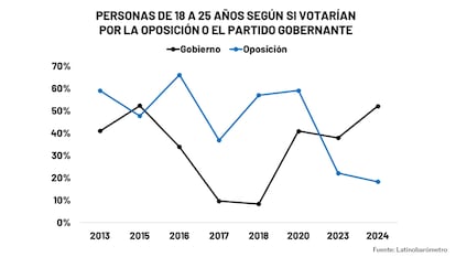 Lo que realmente parece estar sucediendo en México es que, muy recientemente, los jóvenes han comenzado a sentirse afines al partido en el poder. El dato más revelador es que, hasta 2023, y con la excepción de 2015, los jóvenes solían votar en mayor medida por partidos opositores que gobernantes. No más. Nuevamente con datos de Latinobarómetro es posible identificar que, la mayoría de los jóvenes (73%) reportan querer votar por la coalición gobernante, aunque todavía en menor medida que el resto de la población (74%).