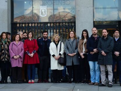 Cristina Cifuentes junto al embajador de Bélgica, Pierre Labouverie, y Manuela Carmena, con Pablo Iglesias, expresan su rechazo al ataque vivido en la capital belga