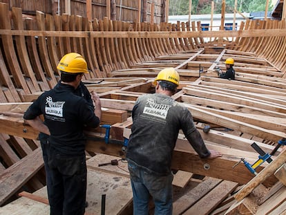 Hugo Almonacid es parte del equipo de la factoría marítima Albaola, que reconstruye la embarcación con las técnicas tradicionales del 1500 en el País Vasco