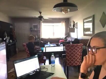 Katie Stevens, madre de tres hijos y que vive en Carolina del Sur, cuelga un video que muestra la realidad de trabajar en casa con sus hijos
