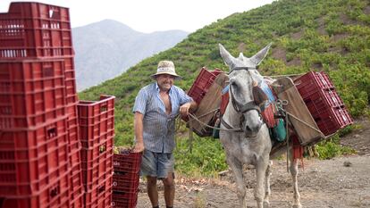 El papel de las mulas en la comarca de la Axarquía, territorio repleto de lomas con gran pendiente en el este de Málaga, es fundamental para sacar adelante la campaña
