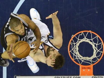 El pívot de 37 años decide para San Antonio (93-89) un reñido duelo y le pone la final muy difícil a Memphis (2-0)