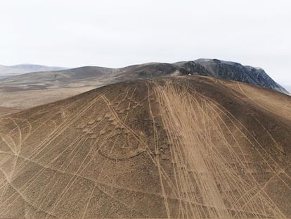 Las imágenes difundidas por la organización que trabaja por la protección del patrimonio arqueológico muestran numerosas marcas de ruedas sobre las figuras geométricas