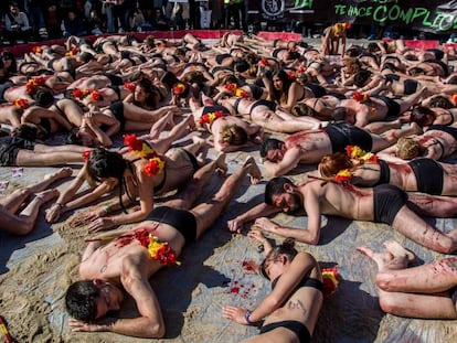 Un centenar de activistas se desnudan y se tiñen de rojo ante el Ayuntamiento de Pamplona