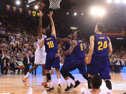 Un triple de Carroll sella la remontada in extremis del conjunto de Laso ante un Barça que dominaba por nueve puntos a menos de dos minutos del final y deja a los blancos a un paso del título de Liga (81-80)