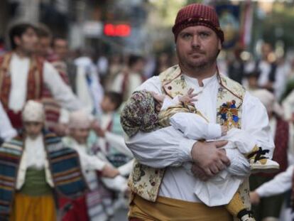 Miles de falleros desfilan para entregar los ramos con los que se crea el manto de la Virgen